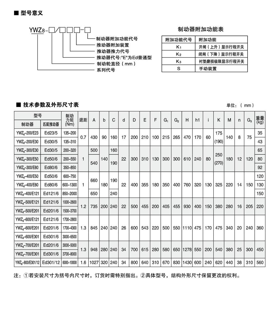 YWZ8.YWP系列電力液壓鼓式制動器的連接尺寸和制動力矩參數符合JB/ZQ4388-86和GB6333-86(帶A系列)標準,技術要求符合JB / T6406-2006標準,配套符合DIN15430標準的Ed系列推動器。